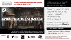 El Consorcio de Rehabilitación Puerto de la Cruz, en colaboración con el Cabildo de Tenerife, el Observatorio de la Calidad de Tenerife (OCATEN), Comercio de Tenerife, el Centro Insular de Calidad y Consumo Responsable del Cabildo de Tenerife y la Concejalía de Comercio de Puerto de la Cruz, organiza una formación el próximo martes 10 de diciembre de 13:15h a 14:15h, denominada "Conoce el proceso para obtener y tramitar las nuevas hojas de reclamaciones para tu negocio".